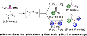 A formamidine intermediate generated in situ was used as the nitrogen source in a reaction with thioacids to obtain amides. The