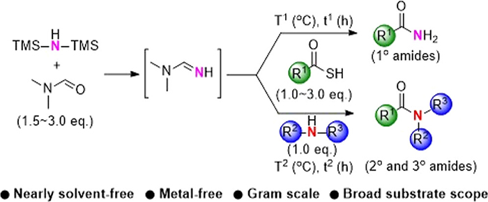 A formamidine intermediate generated in situ was used as the nitrogen source in a reaction with thioacids to obtain amides. The synthetic protocol described in this paper can be used in the generation of various primary, secondary, and tertiary amides with organic thioacids used as substrates under the optimized conditions. Notably, this protocol uses readily available materials, is nearly solvent-free, supports gram-scale synthesis, and yields structurally diverse amide products with favorable efficiency.